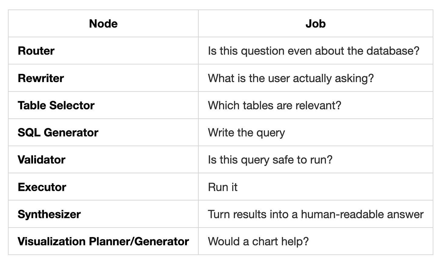 The insight is that text-to-SQL isn’t one problem, it’s several smaller ones chained together. When you decompose it into specialized nodes, each with a single job, you get a system that’s easier to debug, easier to improve, and resilient to failure.