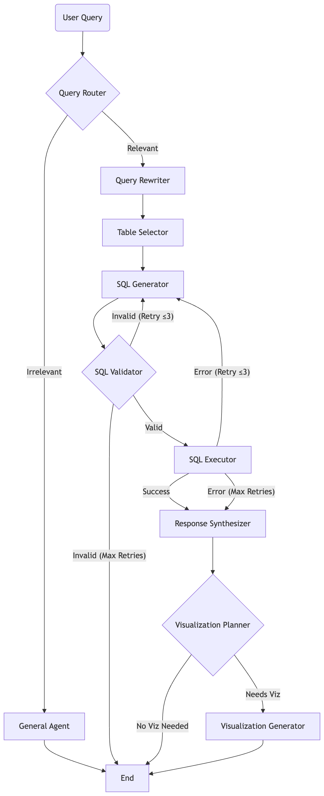 The retry loop is the key architectural decision: if the SQL fails validation or fails at runtime, the graph routes back to the SQL generator with the error message injected into the conversation. The LLM sees what went wrong and corrects itself , up to 3 times before giving up gracefully.