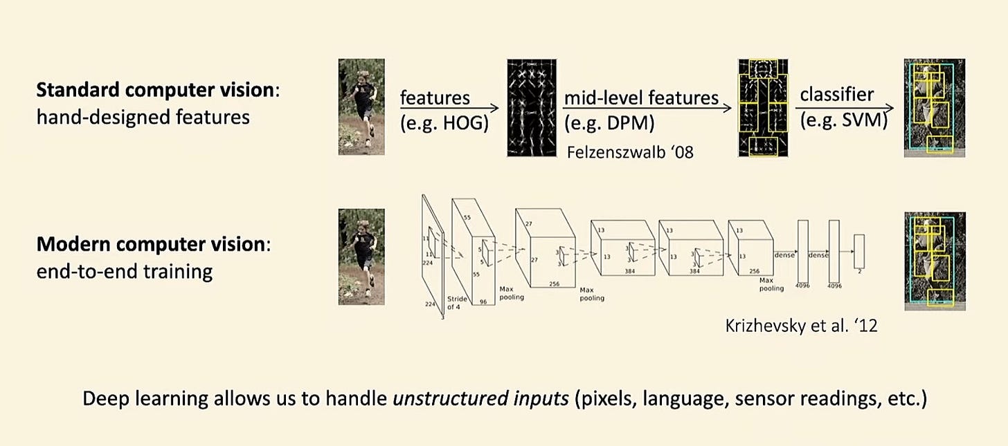 What's the difference between standard computer vision where there were a lot of hand-designed features, versus the modern end-to-end computer vision?