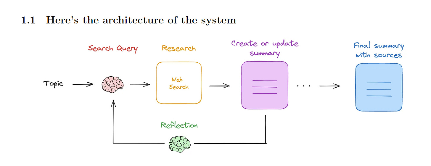 🚀 Core architecture components: search query generation, web search, summarization, reflection