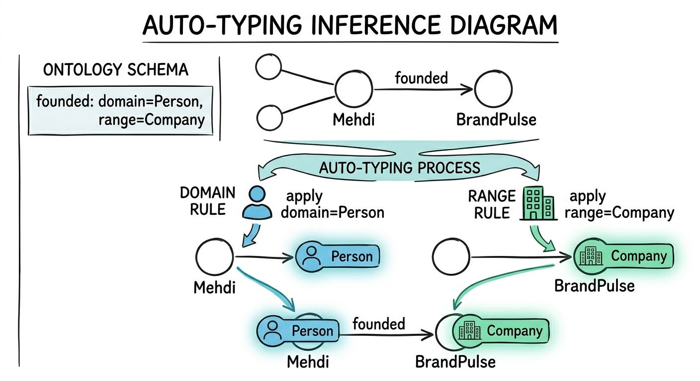 Property: founded (domain: Person, range: Company)Now when someone adds (Mehdi, founded, BrandPulse), the system automatically infers that Mehdi is a Person and BrandPulse is a Company. This is called auto-typing, and after working with it for over a decade, I can tell you it’s one of those capabilities that seems minor until you realize how much manual annotation it eliminates at scale.