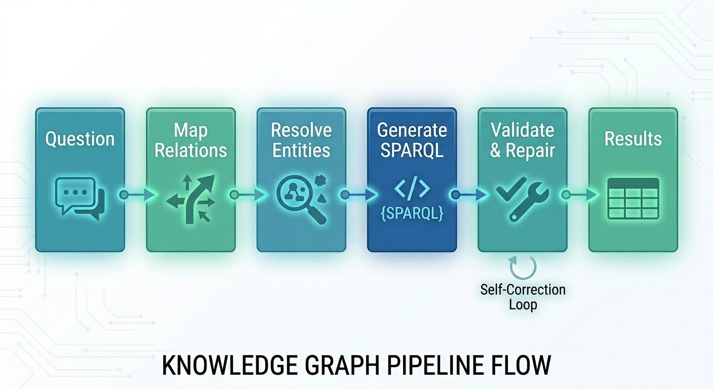 Relation mapping -- Before generating SPARQL, an LLM call maps natural-language phrases (”works at,” “born in”) to actual predicates in your graph. This produces explicit mappings that get injected into the generation prompt.