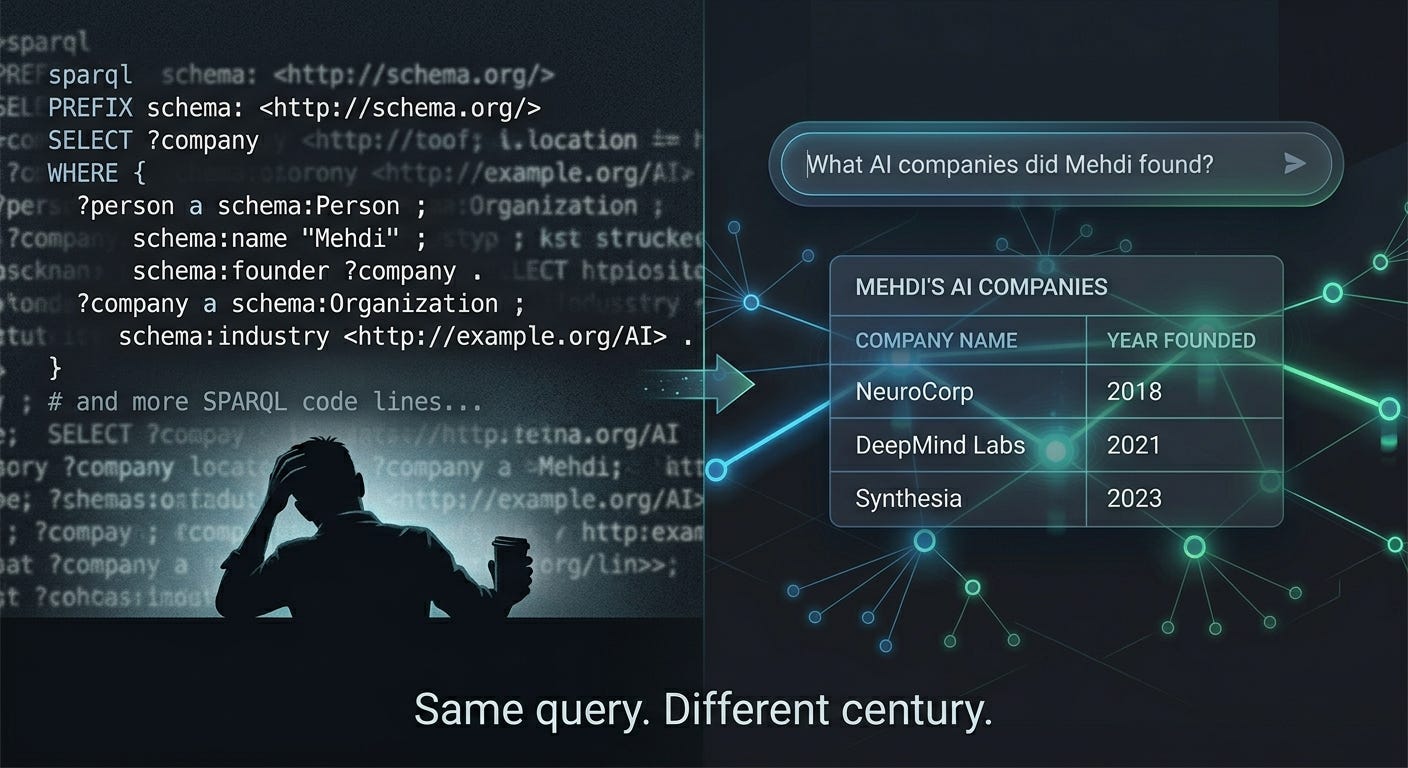 If you’ve worked with knowledge graphs, you know this story. You show someone a beautifully reasoned inference chain -- how (Mehdi, founded, BrandPulse) plus the ontology’s domain/range constraints automatically infers that Mehdi is a Person and BrandPulse is a Company. They’re impressed. Then you show them the SPARQL they’d need to write to query it, and their eyes glaze over.